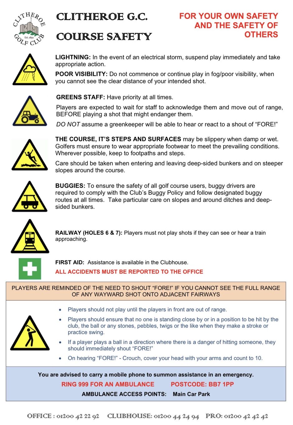The health and wellbeing of our members and visitors is paramount. Golf can be a dangerous sport, so each player is expected to be aware of both their own and others' safety at all times. Please refer to this guide and familiarise yourself with our health and safety policies